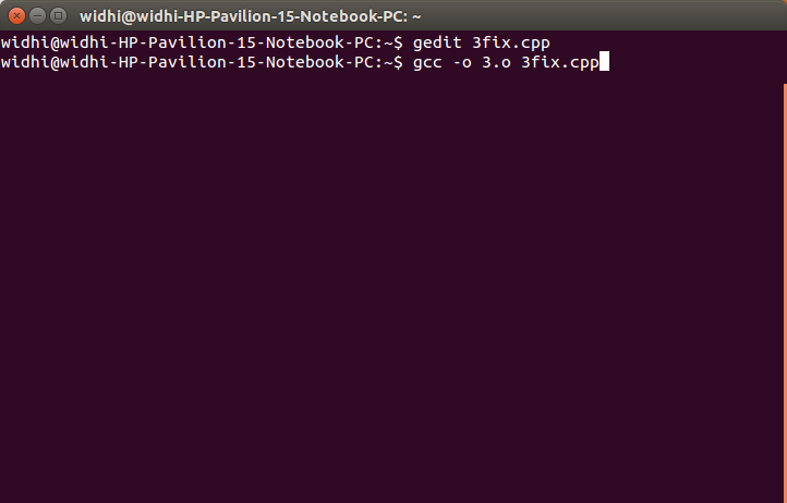 3. ketik "gedit namafile.cpp" (contoh : 3fix.cpp)